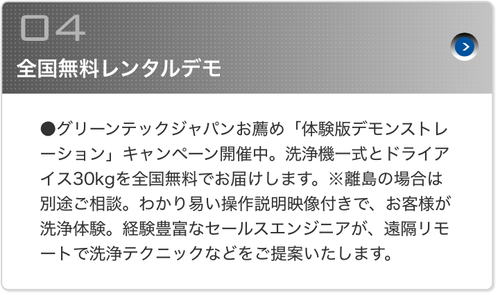「デモ翌日以降も引き続き洗浄テストを行いたい」と購入を前向きにご検討のお客様だけに有料でお貸しいたします。手続き方法は、入力フォームの一番下の「お問い合わせ内容」に有料貸出希望とご入力ください。御見積書を作成いたします。有料貸出機の数には限りがございます。希望日には余裕をもってお申し込みください。貸出後、オンライン打合せで質疑応答と今後についてご提案いたします。